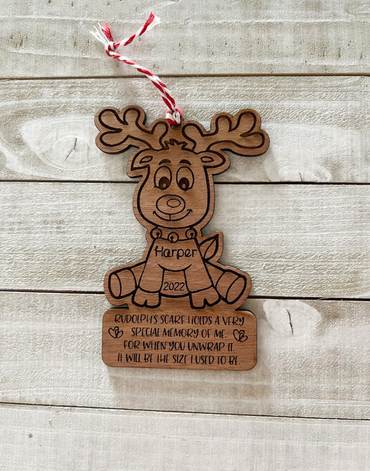 Rudolph Personalized Child’s Ornament | Reindeer Ornament Scarf is Height of Child | Customized Baby Ornament