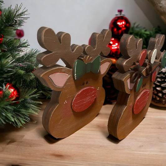Reindeer Wooden Decor | Hand Painted Rudolph and Girl Rudolph Decoration | Shelf Sitters