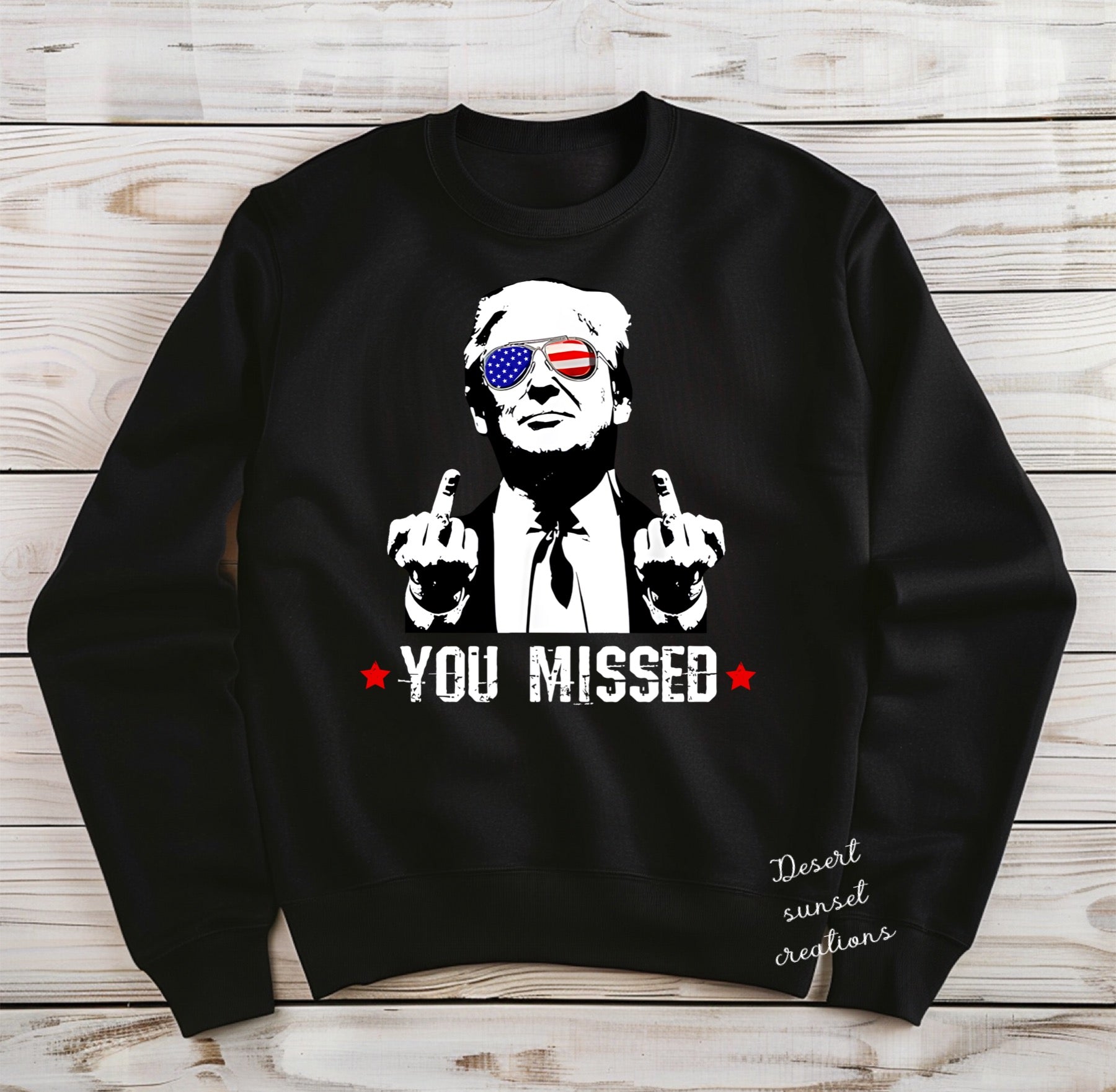 Introducing our bold and irreverent "You Missed" design, now available on your choice of t-shirt, long sleeve crew neck, or hoodie in classic black or heather gray. This unisex garment features a striking image of Trump, unmistakably flipping off, accompanied by the defiant message, "You Missed." MAGA